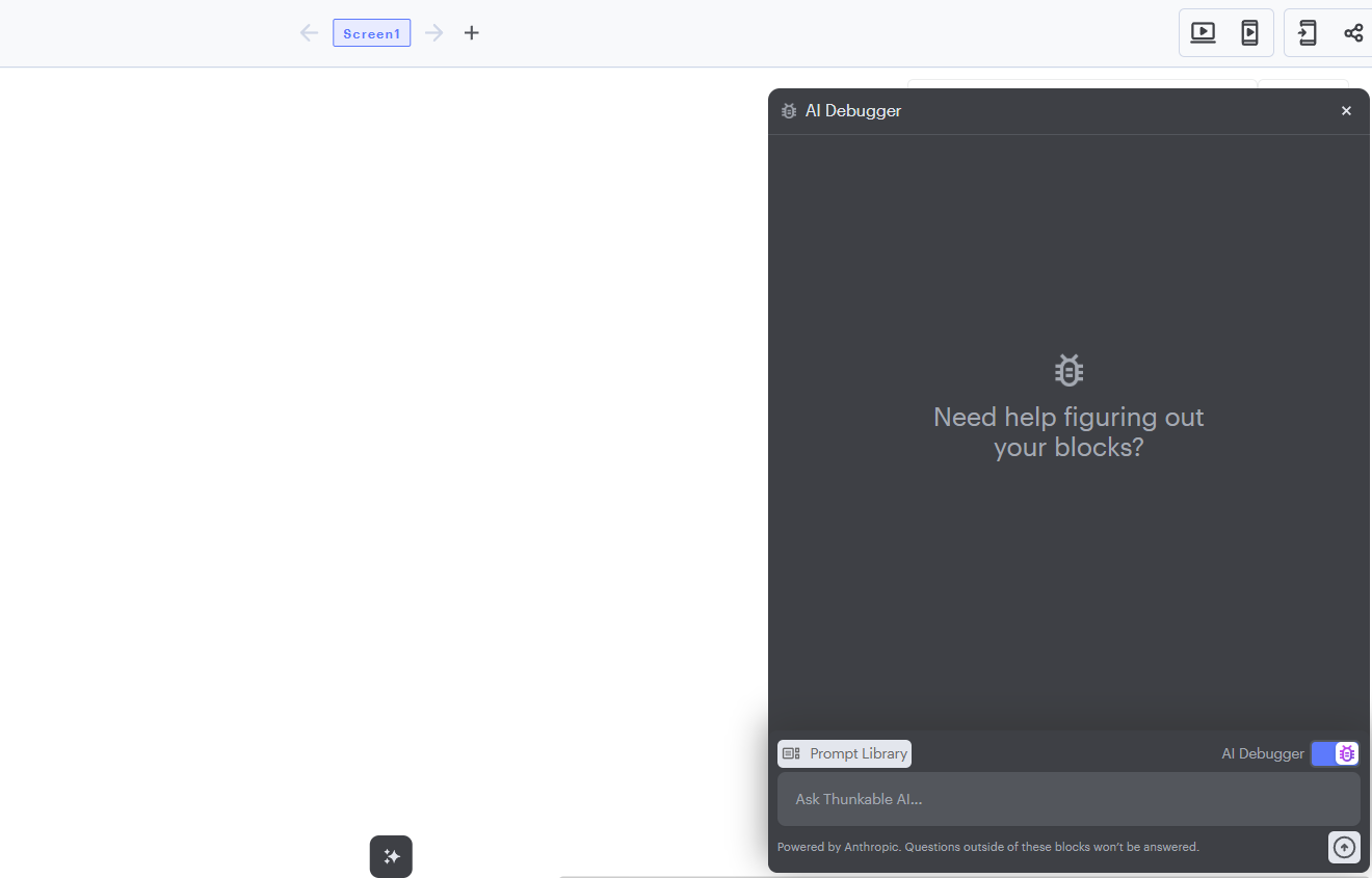 The AI Debugger helps identify and explain issues within your blocks. It provides feedback and suggestions to improve your logic or fix errors.