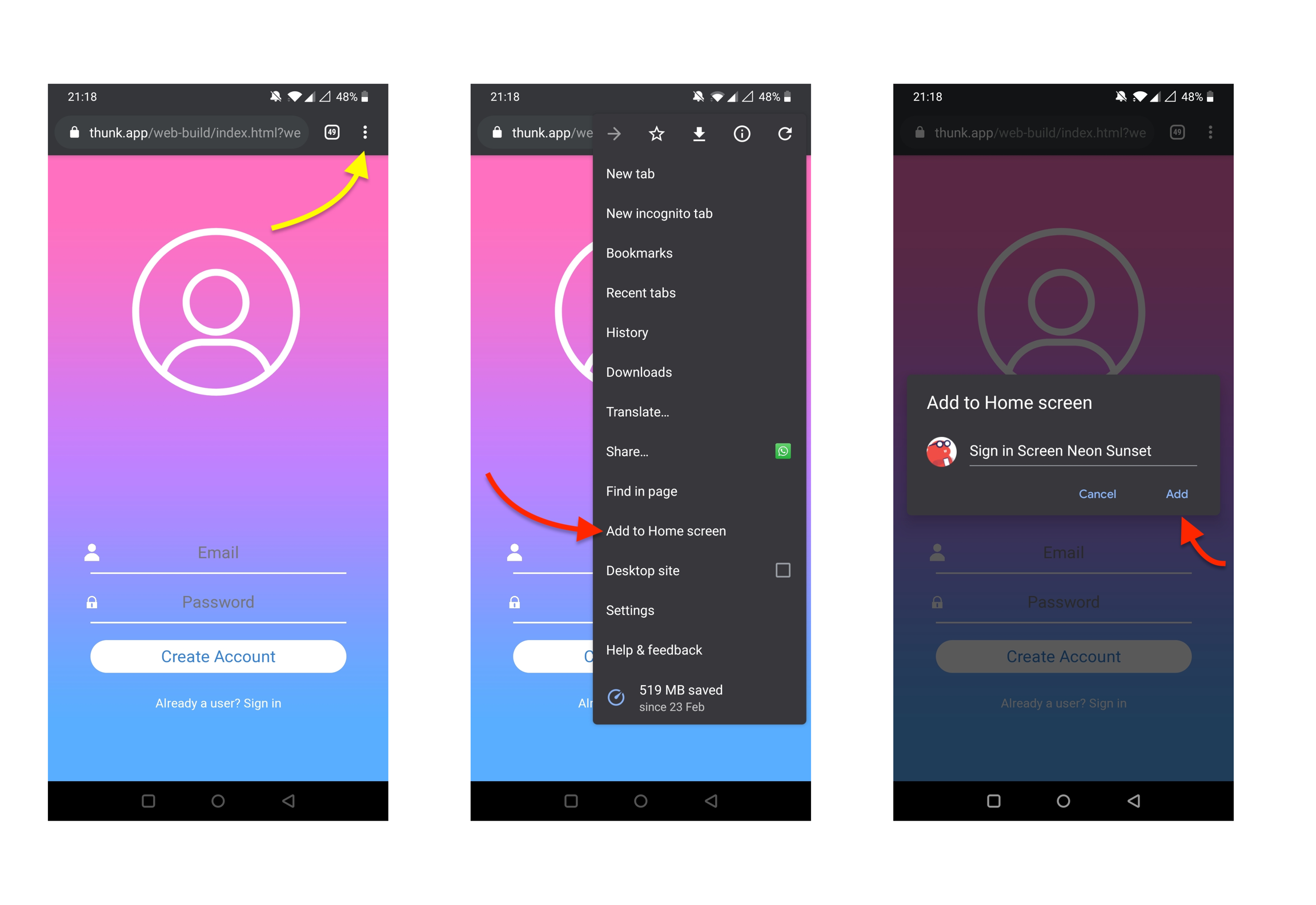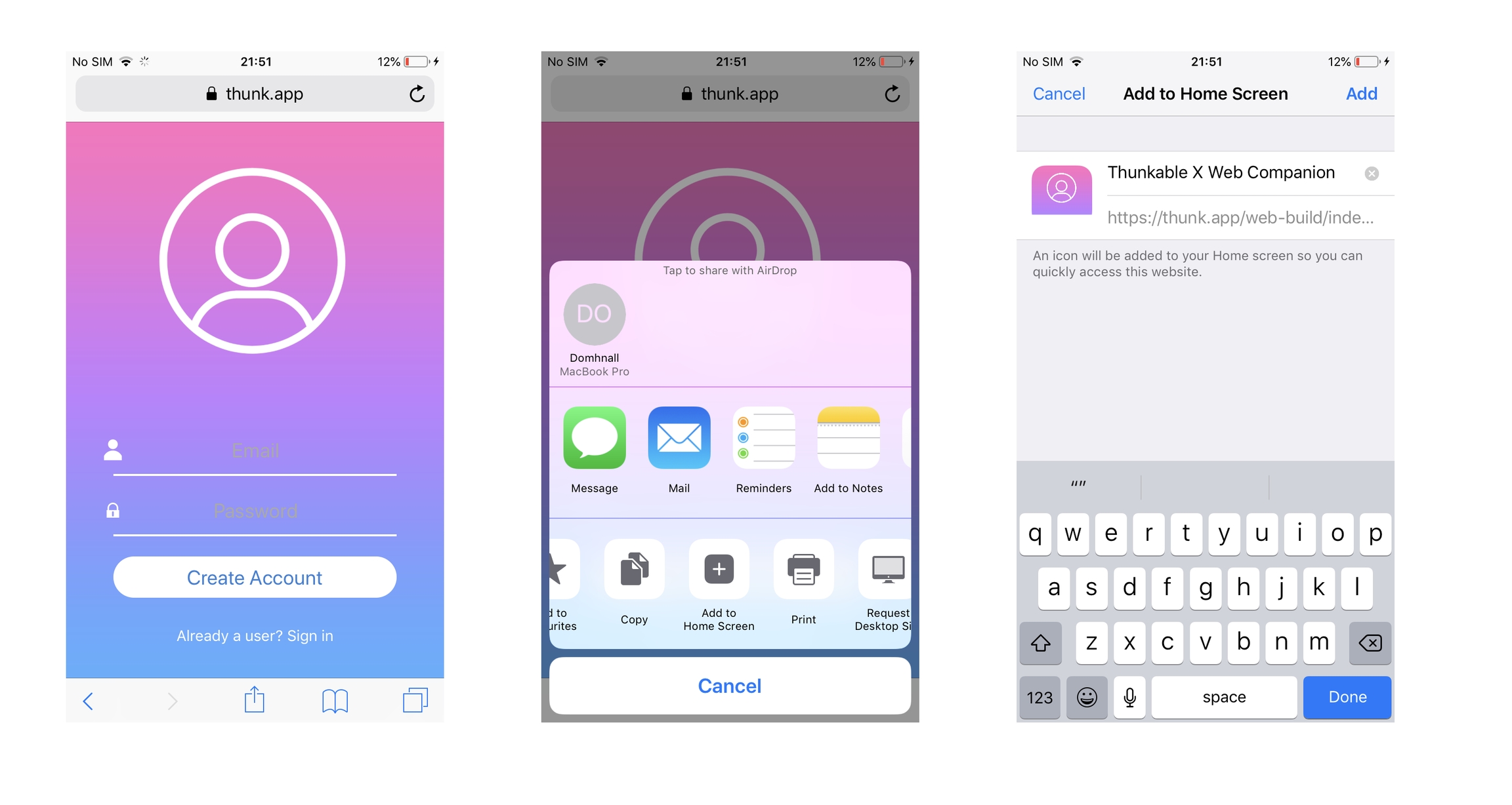 Start by opening your Thunkable mobile web app in your web browser. This example uses the Safari browser. Click on the share button and choose the "Add to Home screen" option. Next you must choose whether to place the app manually or automatically.