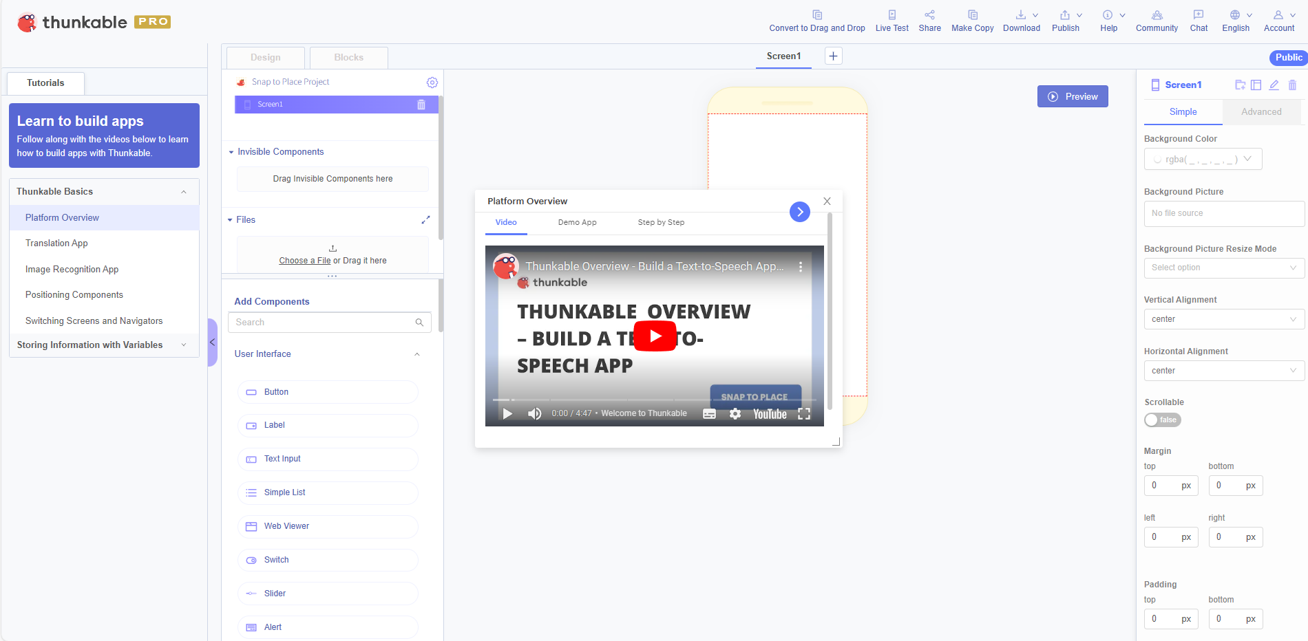 To learn how to use Thunkable, try our in-platform tutorials. Click on the expand arrow on the left to open the tutorials panel. Click on a tutorial name to launch the video in a modal you can resize and move anywhere on the screen.&#x20;