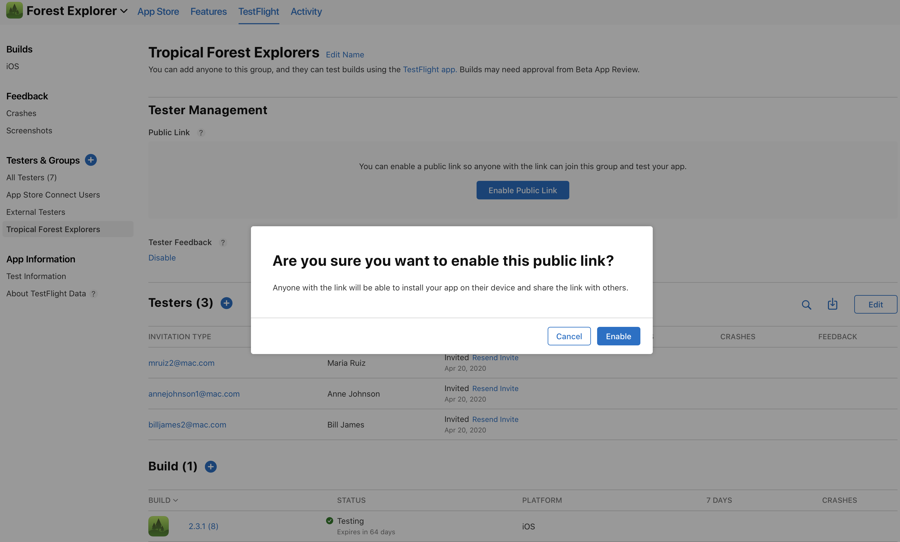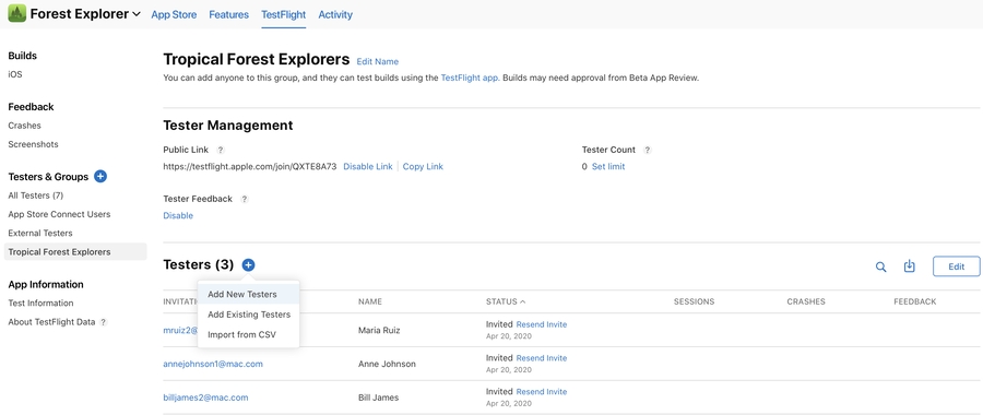 Keep in mind that anyone can share this link, so testers may be able to join your testing group even if you don't invite them directly. If a tester joins your group using a public link, their name and email will not be displayed in the Testers section in App Store Connect (it will display as anonymous), but you will be able to see their installation date, sessions, and crashes. You can disable the public link at any time.