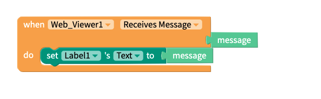 The "when web viewer receives message" block fires when the web viewer receives a message from the web page it's displaying. It returns the "message" output, text that contains the message that was received.