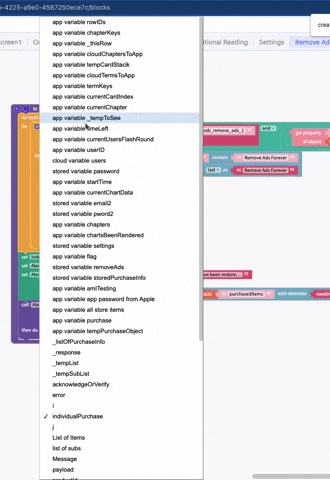Notice the _listOfPurchases variable. you can create that by clicking the cog wheel, dragging an input name block into the inputs receiver, and giving it a meaningful name
